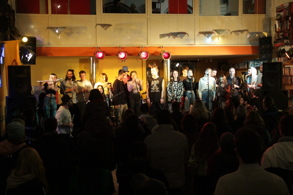 Our second concert is taking place in the Roter Baum facilities, celebrating the 30 years of its existence. Our band was happy to share and represent the organization, its ideas and its long tradition. We were first to open this exciting evening, which really set the mood for the other bands and for the audience. After the performance, our participants could relax, enjoy and dance to the newest hits, learning a phrase or two, such as „Zugabe!“ We had a pleasure to listen to the band „B6BBO“ who stole our attention with their catchy songs, funky outfits and charming smiles. Last on the line up was the band „Sorry for the music“. Don’t let the band name fool you – the only thing we were sorry for, is that it didn’t last longer. The crowd was jumping, dancing and singing the lyrics in ecstasy. And if these bands weren’t enough, there was a seperate room with a DJ, blasting the best hits, a fire pit outside to make you warm while you chat with the others and an exhibition room with all of the Roter Baum’s biggest moments and memories. As the night is ending, we are able to collect our thoughts, remind ourselves of the important things in life, be grateful for new friends and go home full of experiences.